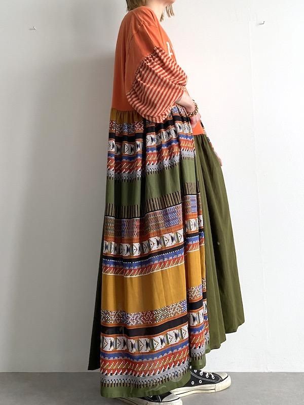 Aラインシルエットのリメイクロング丈ワンピース。